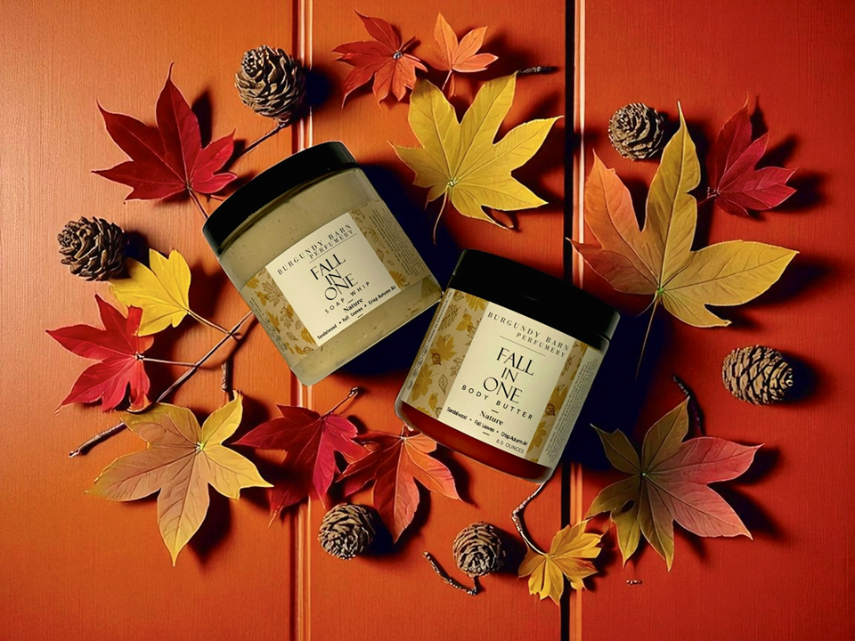 The Burgundy Barn Perfumery Fall Collection is our way of capturing that rustic charm of autumn with candles—filled with rich, familiar scents that bring the heart of the season right into your home. Our Fall in One collection, featuring whipped body butters and soap whips, comes in two enchanting versions: a fresh, nature-inspired blend and a rich, sweet-and-spicy scent—both designed to nourish your skin while enveloping you in seasonal warmth. Each product is crafted to help you slow down, savor the moment, and embrace the season with open arms.